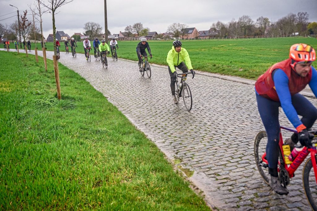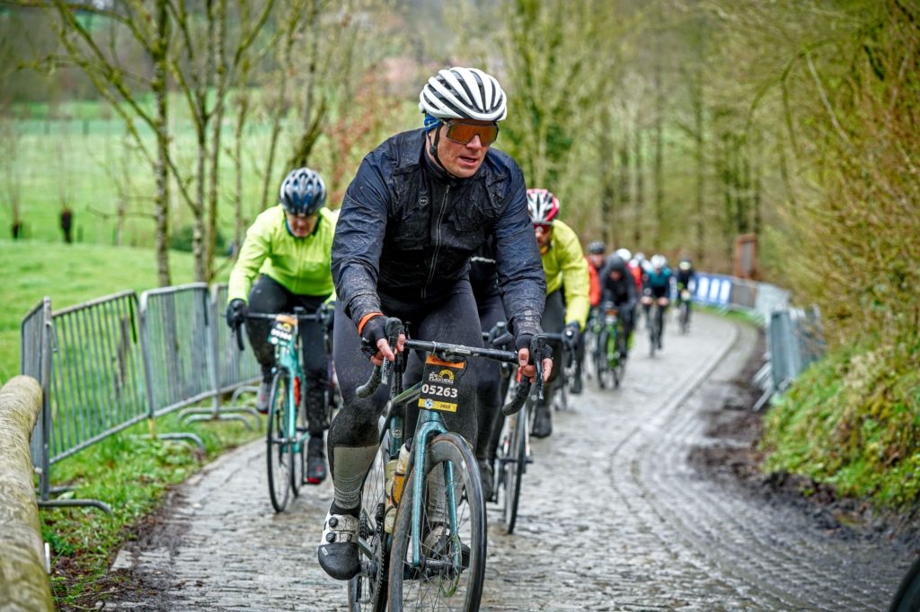 Samstagfrüh wurde in aller Bälde das Startgelände aufgesucht wo sich 8 Laufradler (inkl. 2 Gastradler) auf den unterschiedlichsten Strecken, neben 16.000 anderen Teilnehmern aus aller Herren Länder. Das Wetter war zu Beginn etwas verhalten und wandelte sich nach etwa 20 Minuten in ein richtiges Klassikerwetter: will heißen viel Wind, Kälte und maßlose Regenergüsse! Nach etwa diesen besagten 20 Minuten erwartete uns gleich die erste Prüfung: die berühmten Kasseien, also Kopfsteinpflasterpassagen! Zuerst glaubt man seinen Augen und Ohren nicht: Man kann da doch nicht drauf fahren, es rattert, es scheppert und kracht unaufhörlich! Man versucht sein Rad möglichst unter Kontrolle zu halten und konzentriert sich vollends auf das Geradeausfahren, bei rutschigen und matschigen Bedingungen eine wahre Kunst. Man darf sich das Pflaster als grobe Steinbrocken vorstellen, welche spitz hinausragen. Schon gleich nach den ersten Metern erblickt man etliche verlorene Trinkflaschen am Pave und auch Trinkflaschen inkl. Halter. Gekonnt wurden die ersten Passagen gemeistert und man fühlt sich nach anfänglicher Skepsis doch wohl am Pflaster. Dass es sich um einen Härtetest für das Material handelt wird einem zum Leidwesen um sein eigens Rad bewusst; von Beginn an hatten etliche Radler mit Platten zu kämpfen, auch unser Schörki. Zum Glück passierte dies am Ende der Paddestraat und ein Servicewagen war zufällig auch zur Stelle und die Panne wurde schnell behoben. Leider traf es Ralf nicht so gut: aufgrund seiner defekten Vorderbremse musste er vernünftigerweise das „Jedermannrennen“ beenden und fuhr zur Unterkunft. Dass sich dies in weiterer Folge als weise herausstellte durften die anderen im weiteren Verkauf feststellen: ein ständiges Bergauf- und Bergab, schmale und noch schmalere Straße, die berühmten Hellingen mit und ohne Pflaster, rutschigste Bedingungen, dazu hunderte Radler und widrigste Wetterbedingungen erfordern ein funktionstüchtiges Rad! Man kommt nicht zur Ruh, kaum lange Flachstücke, immer kupierte Streckenverläufe fordern einem alles ab, besonders, wenn es auf die Muur von Geraardsbergen ging, oder auf den Koppenberg, wo bei 22% Steigung ein Absteigen unumgänglich war.