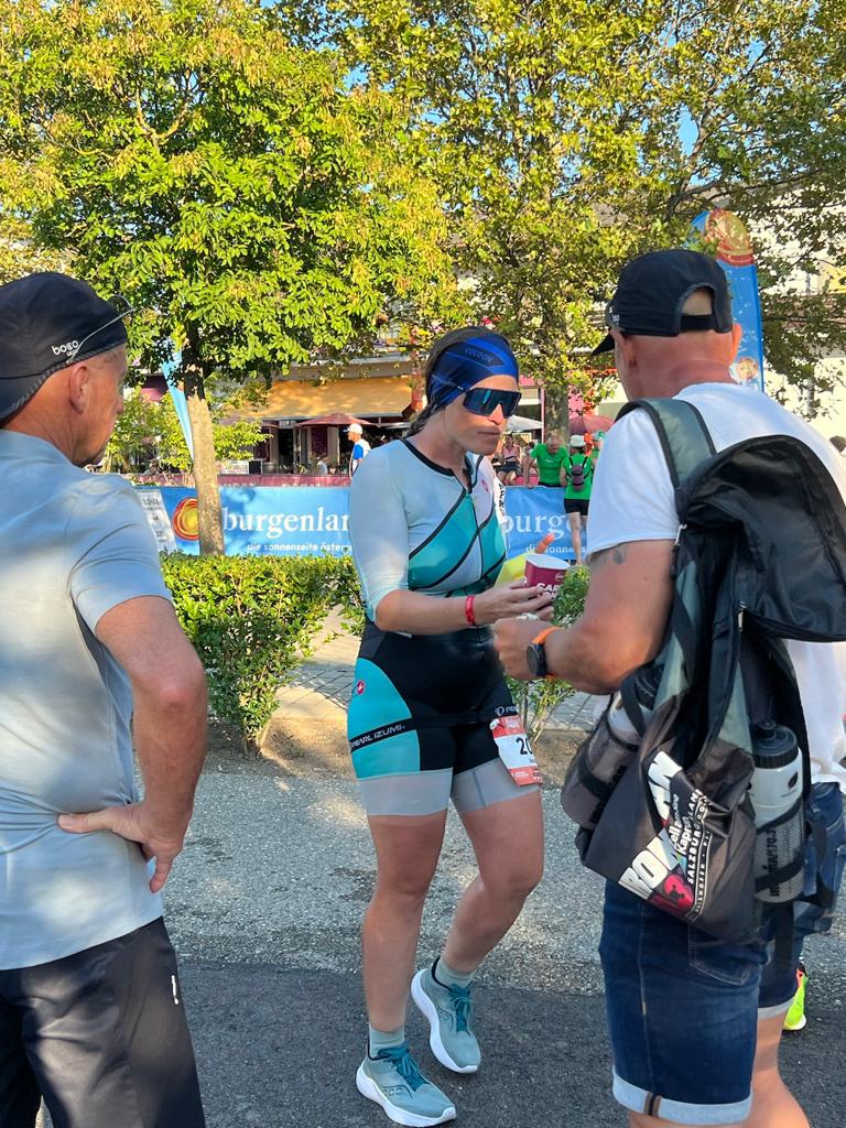 Sandra: Beim Schwimmen und am Rad konnte ich das abrufen was ich mir vorgenommen hatte. Leider zog es mir am Marathon dann relativ rasch den Stecker. Auf der zweiten Runde hatte ich ziemliche Kreislaufprobleme und war mir zu dem Zeitpunkt gar nicht so sicher ob es heute für mich überhaupt einen Zieleinlauf gibt. Irgendwie gelang es mir dann doch aus meinem Tief wieder rauszukommen und weiter zu laufen. Ein grosses Dankeschön an dieser Stelle an unsere Betreuer, die uns an der Labe mit der Eigenverpflegung versorgten. Eine Zielzeit von 12h17min. ist zwar in Podersdorf nicht mein bestes Ergebnis, aber an diesem Tag war ich damit absolut zufrieden.