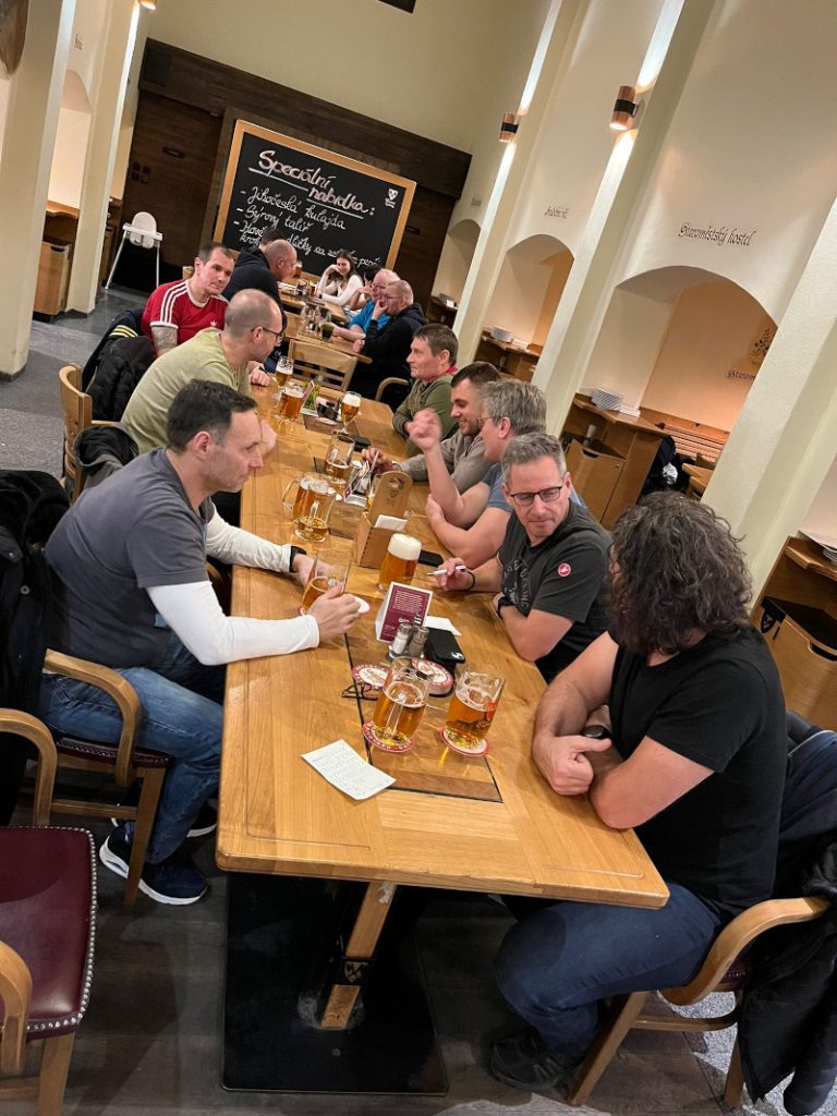 Bereits Freitag nachmittags erfolgte die Anreise nach Budweis, wo wir allesamt in der sehr zentral gelegenen Pension mit dem klingenden Namen „Drei Birnen“, unsere Zelte aufschlugen. Das Warmup erfolgte im Restaurant Fleischbänke, wo wir allesamt von unfassbar hervorragenden lukullischen Genüssen verzaubert wurden. Gutes frisch gebrautes Bier, herzhaft zubereitete Hausmannskost, Sportlerherz was willst du mehr. Die große Freude, durch das gemeinsame Wiedersehen hervorgerufen, verleitete dann ein Groß der wohlgenährten Abordnung noch zu dem ein oder anderen Abstecher in die Beisln am Budweiser Hauptplatz. Ein Blick auf die Uhr verriet unseren Nachtschwärmern, dass es ohnehin eine eher kurze Nacht werden würde.