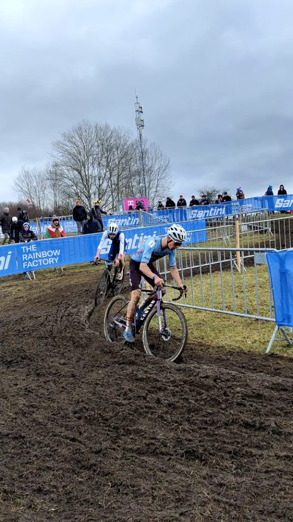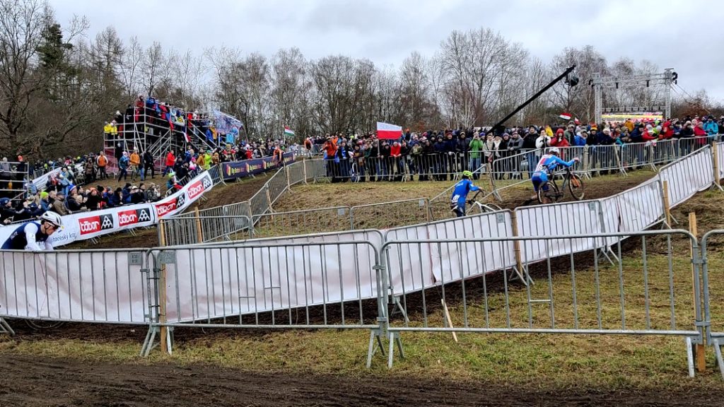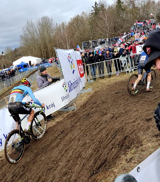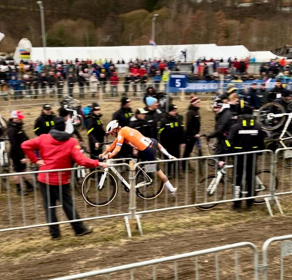 Am Sonntag startete der Renntag mit dem Rennen der Junioren, die zumindest die Rundenzeiten betreffend den U23-Herren nicht wirklich hinten anstanden. Ein kleiner Vorgeschmack auf das Eliterennen der Herren, das dann nach dem Rennen der U23-Damen folgte. Den jungen Damen war deutlich anzusehen wie aufgeweicht und schlammig der Boden bereits war. Sowohl das Tragen des Bikes über die Stufenpassagen hinweg, als auch die engen mit steilen Gegenrampen gespickten Abfahrten, forderten von Runde zu Runde immer noch mehr Körner ab. Beim Eliterennen der Herren war der amtierende Weltmeister und somit auch Titelverteidiger Mathieu van der Poel (MVDP) der große Gejagte. Seine Siegesbilanz (5x Weltmeister Cyclo Cross, Straßenweltmeister, Paris-Roubaix, Mailand-San Remo, Amstel Gold Race, Strade Bianche etc.) sucht seinesgleichen, doch wie würde er seine Renntaktik anlegen? Gleich vorneweg nach dem ersten Rampen suchte er sein Glück in der Flucht, und wurde am Ende der 6 Runden mit seinem sechsten WM-Titel belohnt.