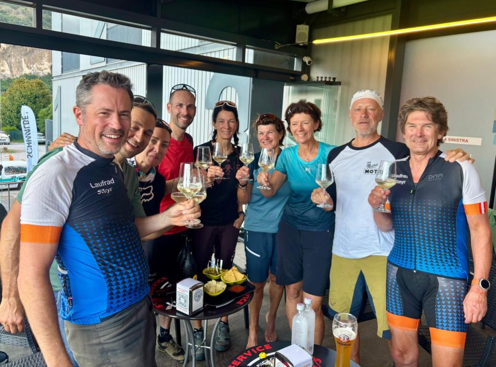 Finale! Ziel: Torbole am Gardasee. Wir starteten bei Sonnenschein, doch mittags überraschte uns ein Regenschauer. Nach einer Pause in einem Lokal ging’s weiter – mit dem Ziel fest im Blick.